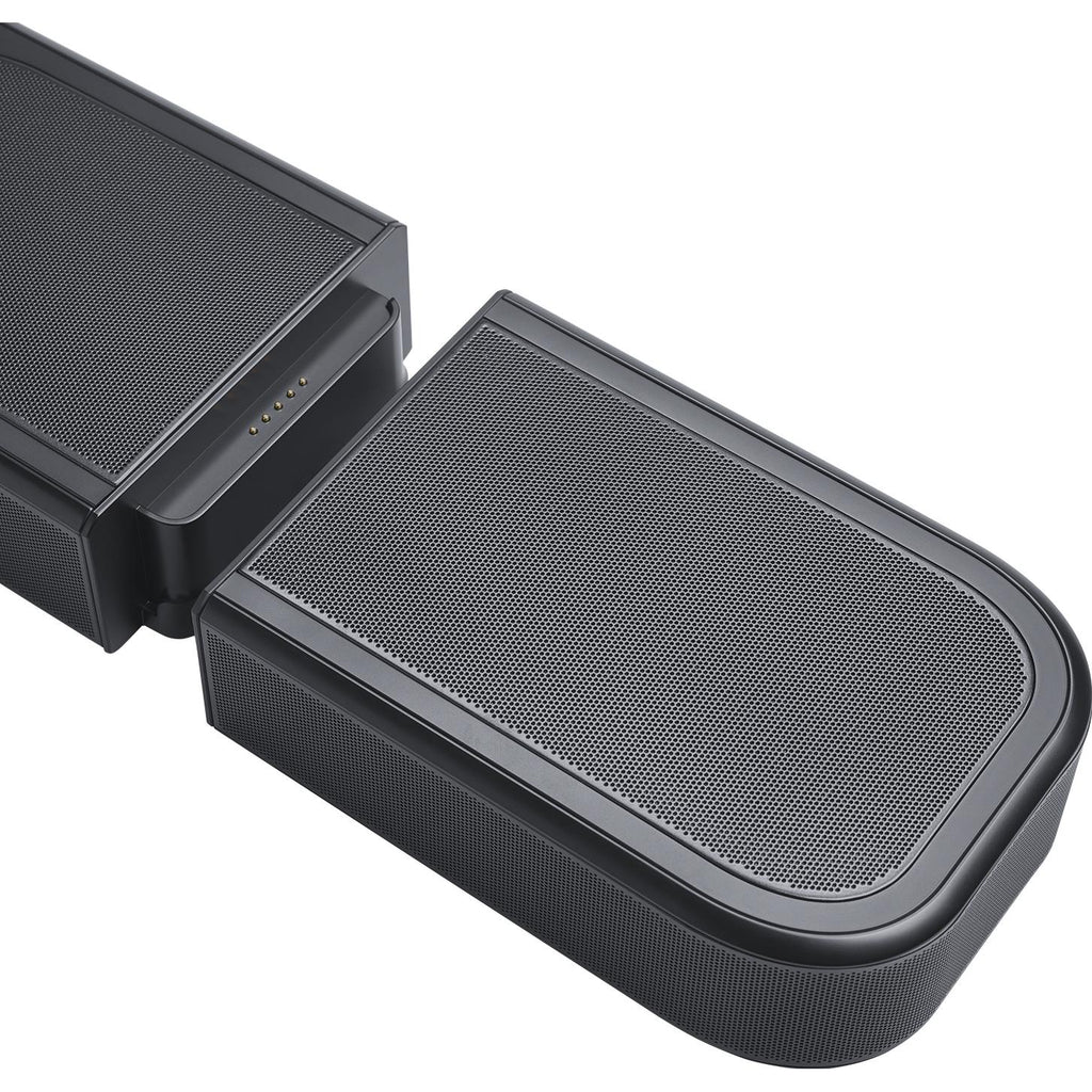 Elevate your 3D surround sound experience with dynamic, immersive height. Four up-firing speakers in the soundbar and wireless rear speakers deliver true Dolby Atmos® sound. No extra wires. No power connections. Just lift the detachable surround speakers off the soundbar—you can do it with just one hand—and place them behind where you want to sit, instantly transforming them into a true surround sound setup. It's that simple. Whether you're binge-watching your new favorite show or hosting a movie night, the speakers' rechargeable long-lasting batteries mean you'll enjoy immersive, cinematic surround sound for hours. When you’re done, simply place them back on the soundbar to charge overnight.